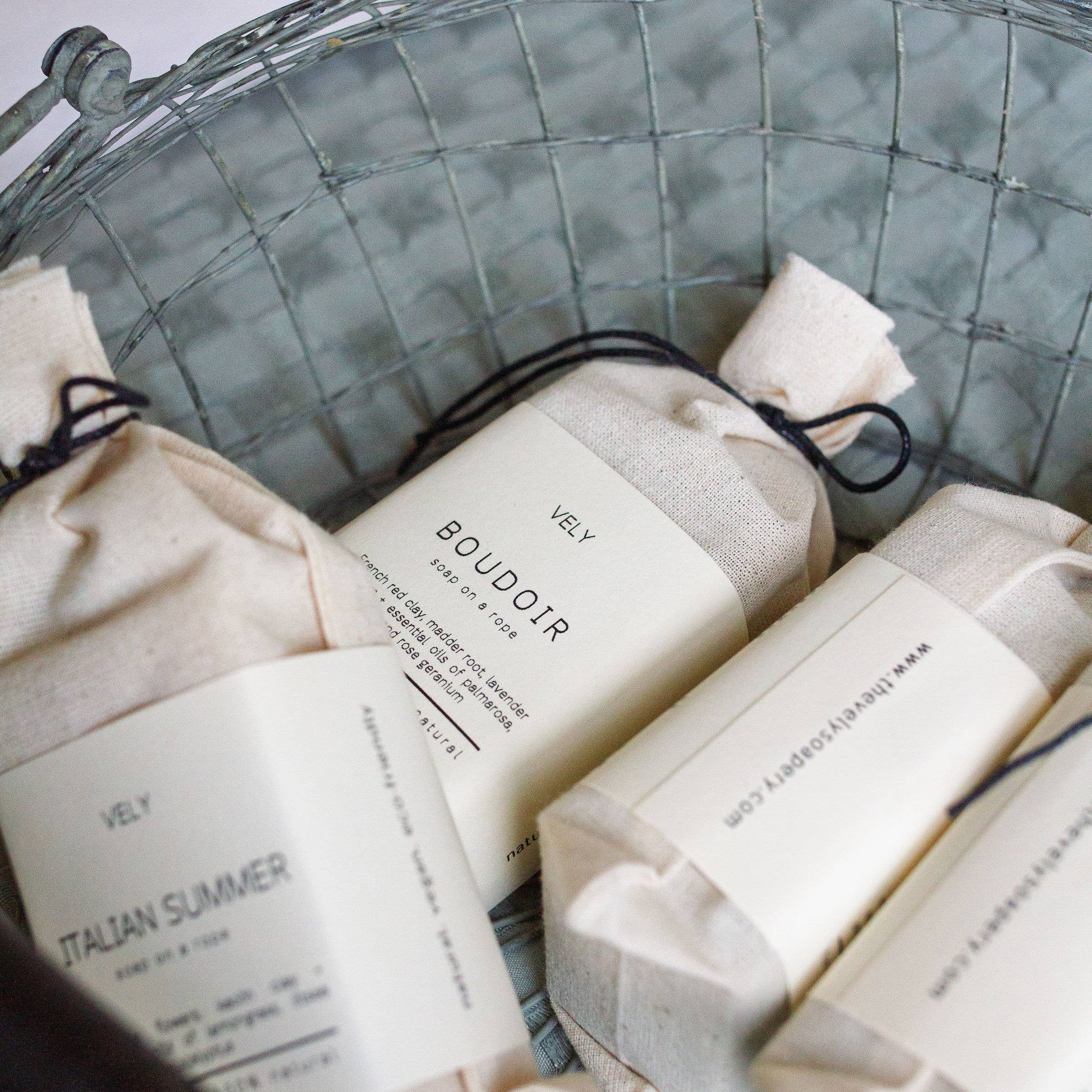 Vely Italian Summer soap bar on a rope and in cotton bag on a light gray background